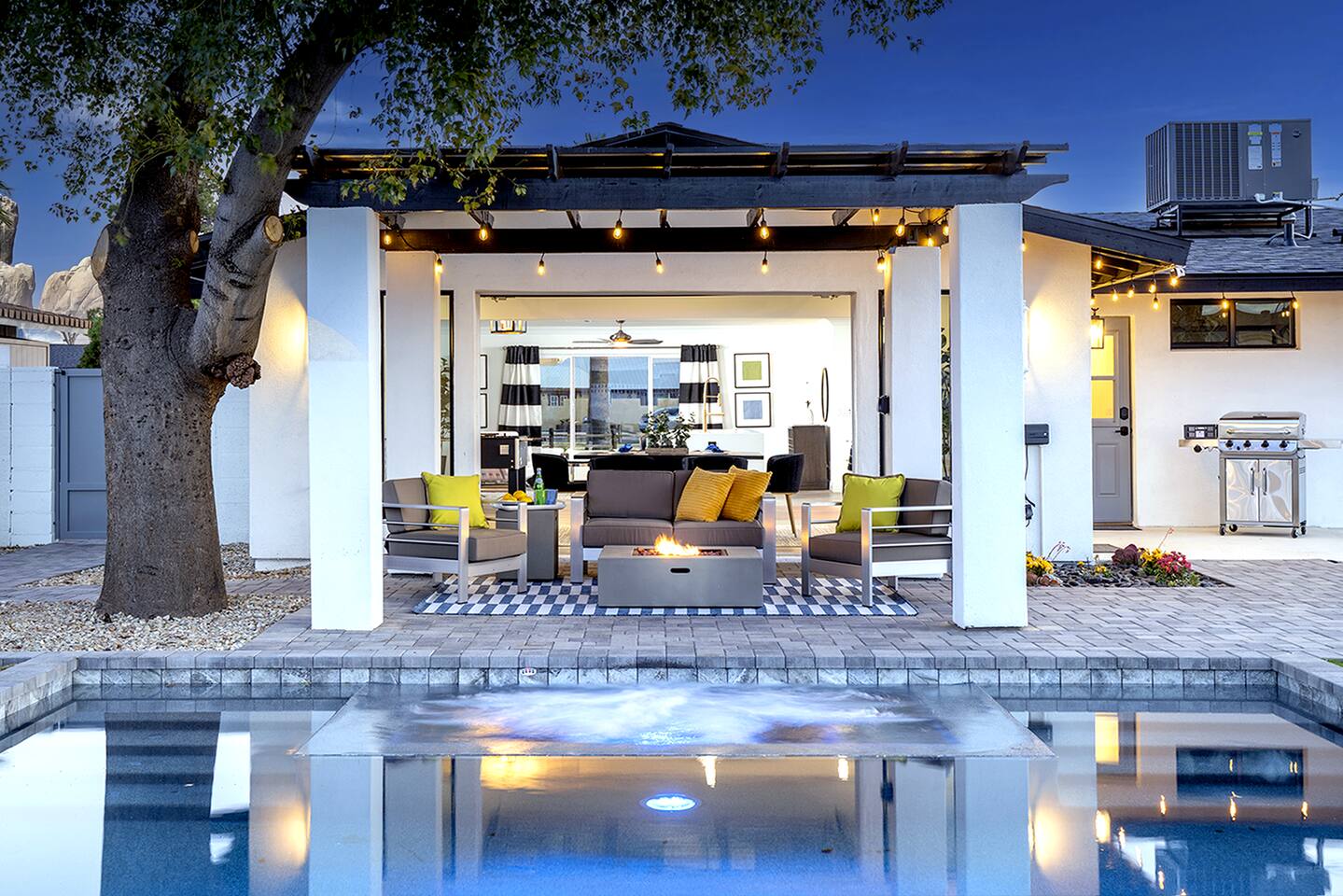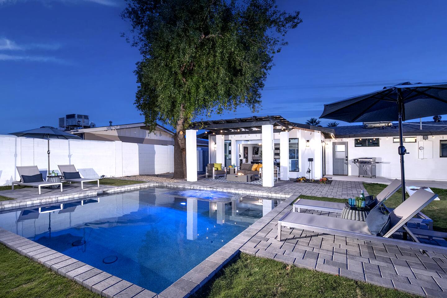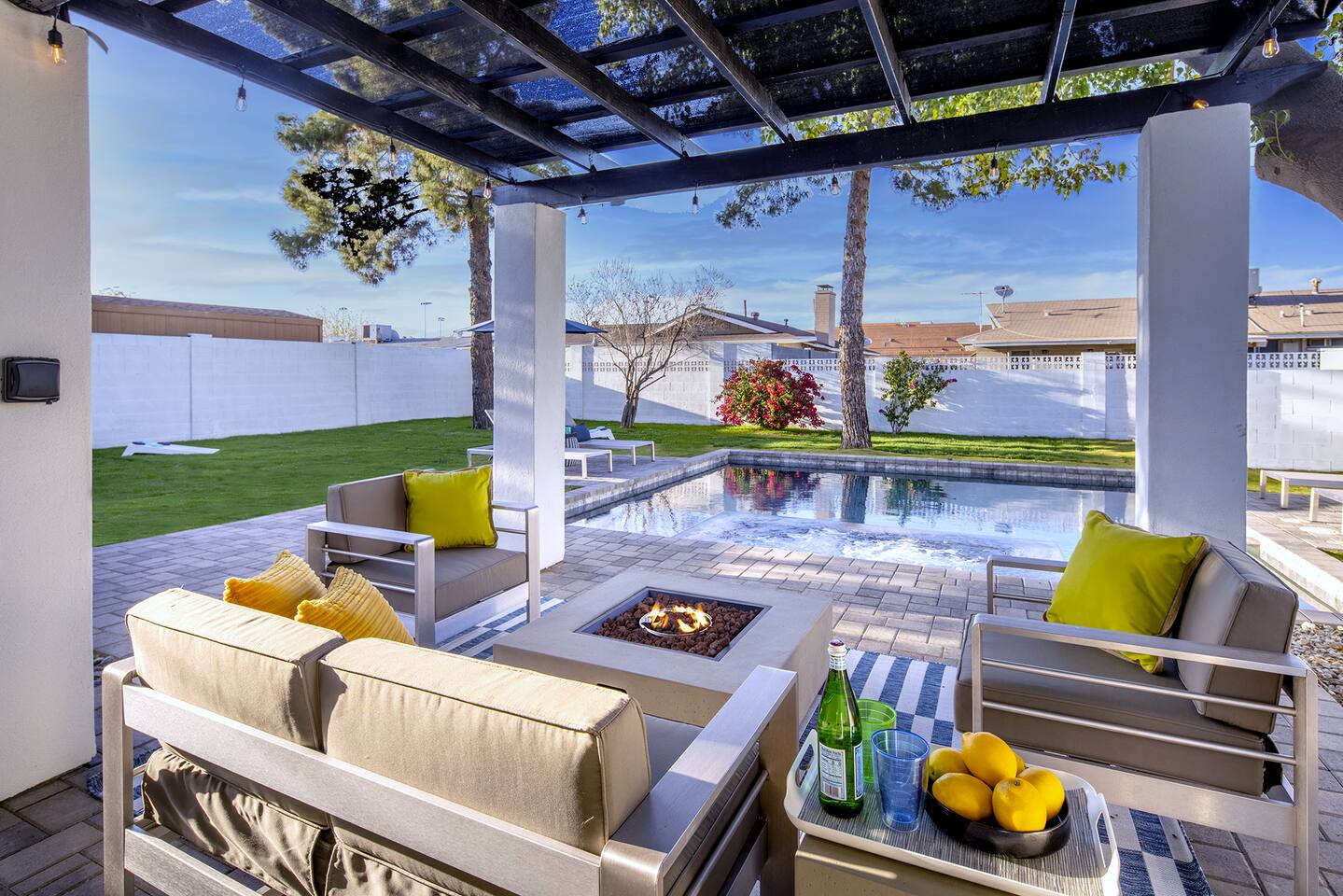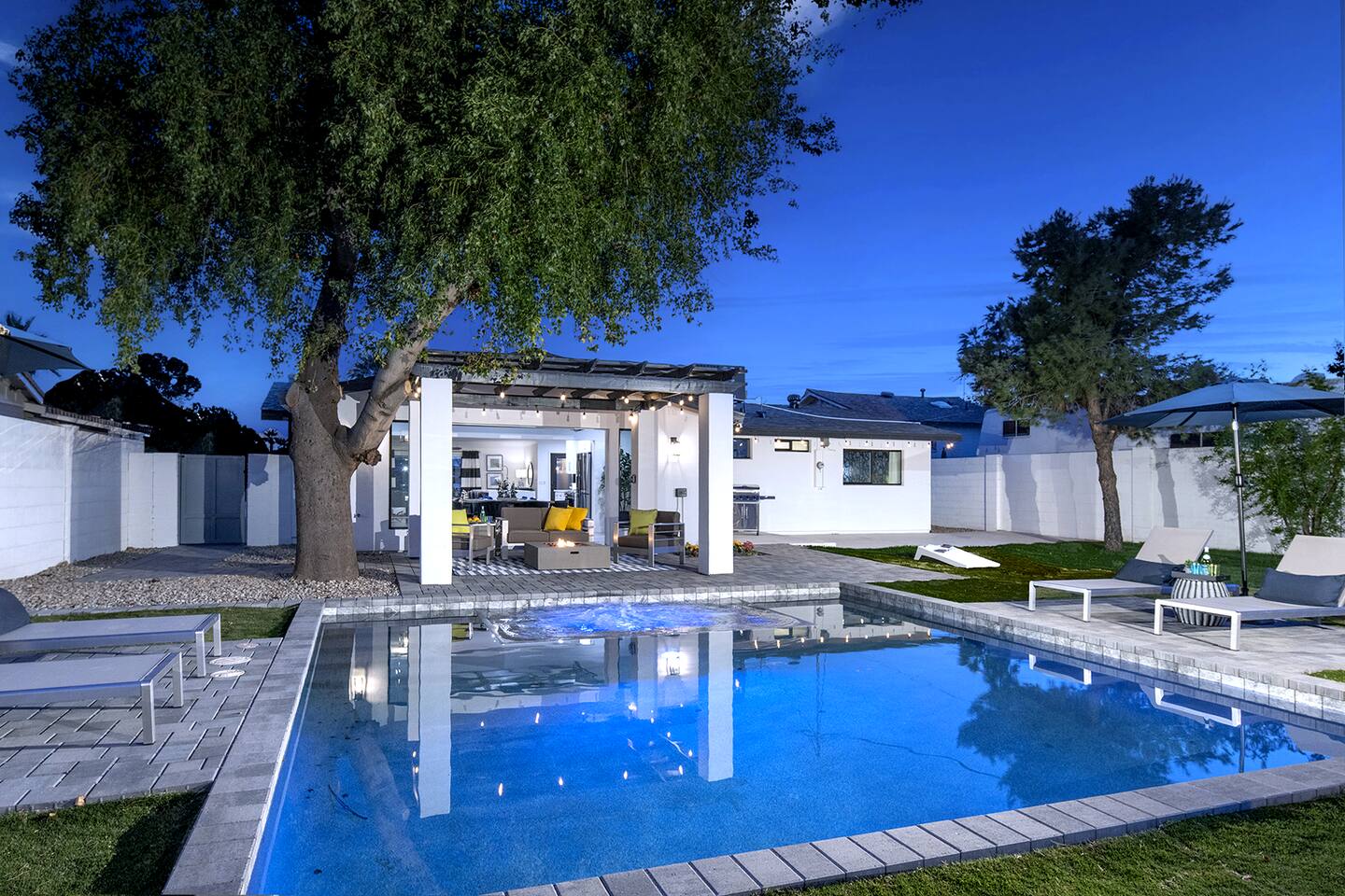 Imagine yourself in a modern sanctuary tucked away on a serene cul-de-sac in the heart of Scottsdale, just minutes away from some of the Southwest's finest restaurants, nightlife hotspots, and captivating art galleries. Step into the living area where the collapsible wall invites you to effortlessly blend with the backyard's vibrant energy or savor the invigorating Arizona breeze. Here, a heated pool, a grand spa, and countless spots to lounge await, perfect for creating cherished memories with your friends, family and loved ones. And for those who dream of a personal butler, a stocked fridge, a private chef, or even in-home yoga sessions, our professional concierge service can turn those dreams into your reality. If you have any questions or special requests, don't hesitate to message us. Your Scottsdale getaway of a lifetime awaits! Cheers, to the good life.