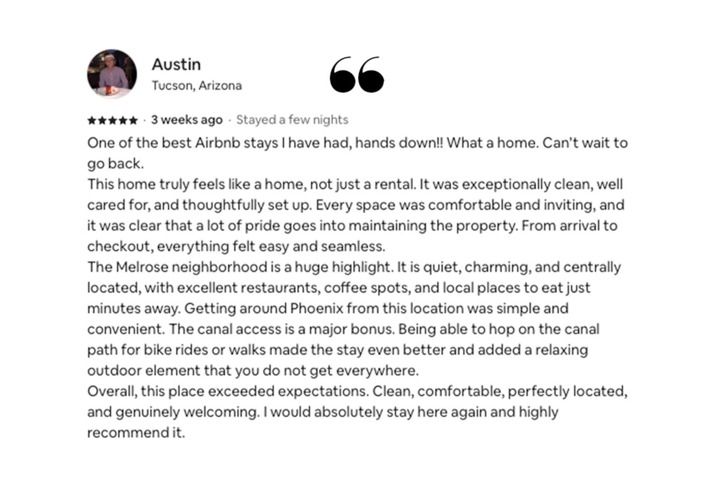 The Melrose neighborhood is a huge highlight. It is quiet, charming, and centrally located, with excellent restaurants, coffee spots, and local places to eat just minutes away. Getting around Phoenix from this location was simple and convenient. The canal access is a major bonus. Being able to hop on the canal path for bike rides or walks made the stay even better and added a relaxing outdoor element that you do not get everywhere.