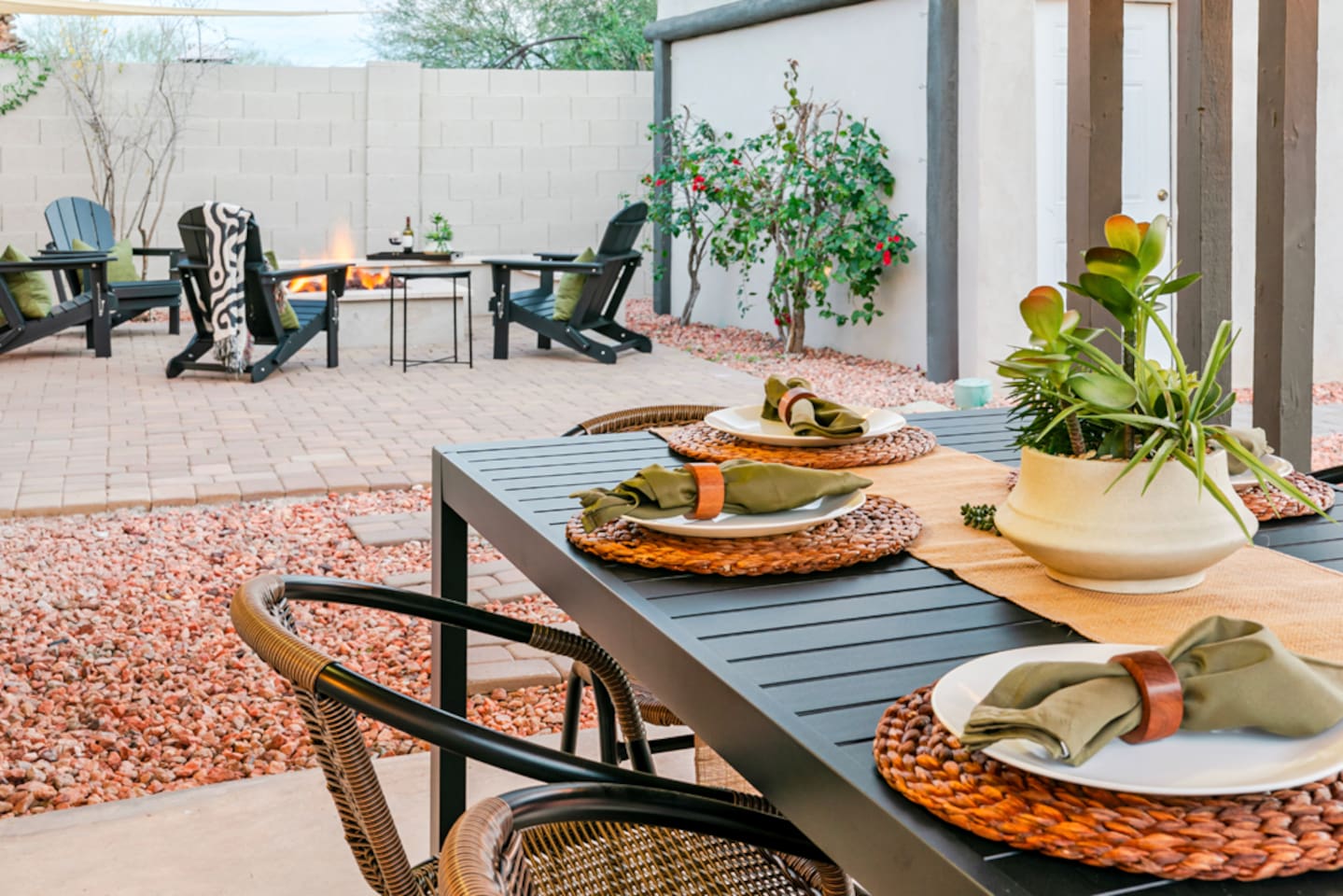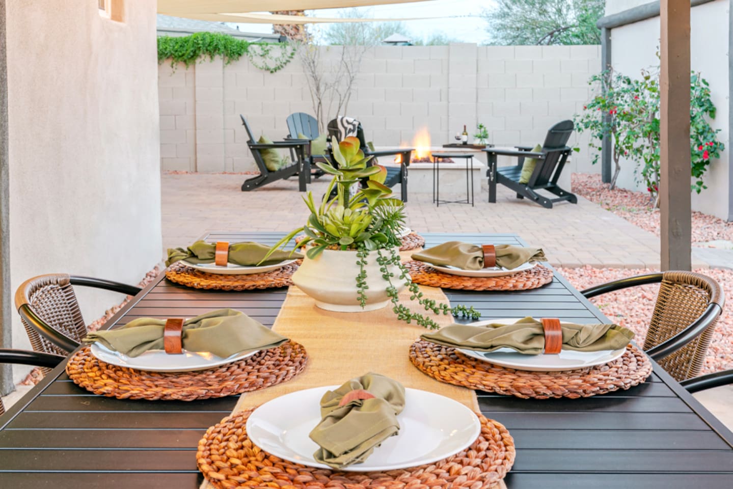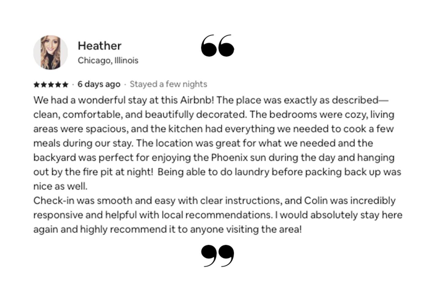 We had a wonderful stay at this Airbnb! The place was exactly as described—clean, comfortable, and beautifully decorated. The bedrooms were cozy, living areas were spacious, and the kitchen had everything we needed to cook a few meals during our stay. The location was great for what we needed and the backyard was perfect for enjoying the Phoenix sun during the day and hanging out by the fire pit at night! Being able to do laundry before packing back up was nice as well.