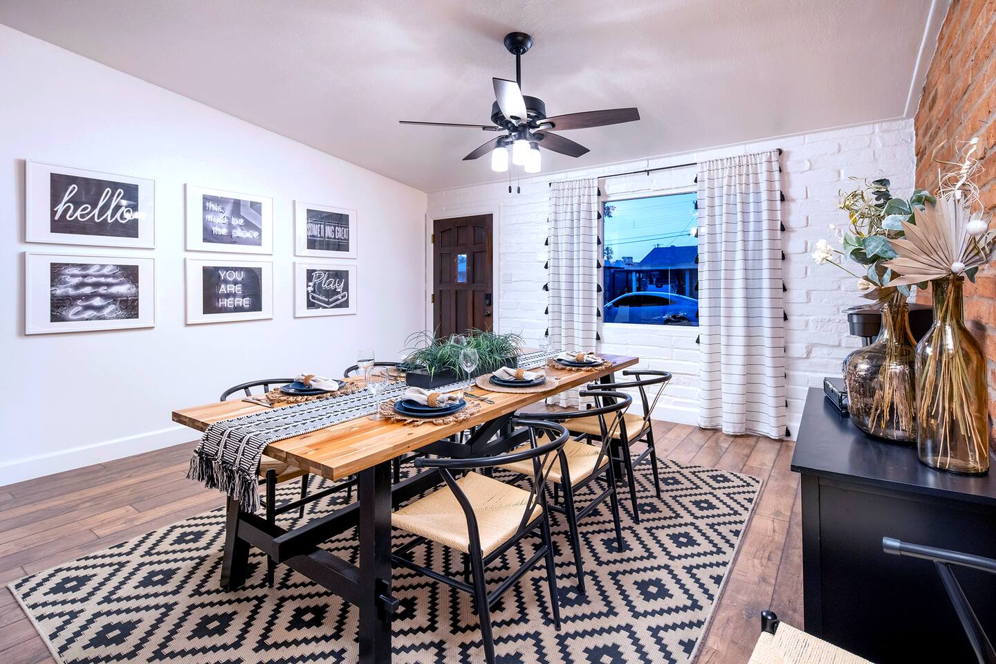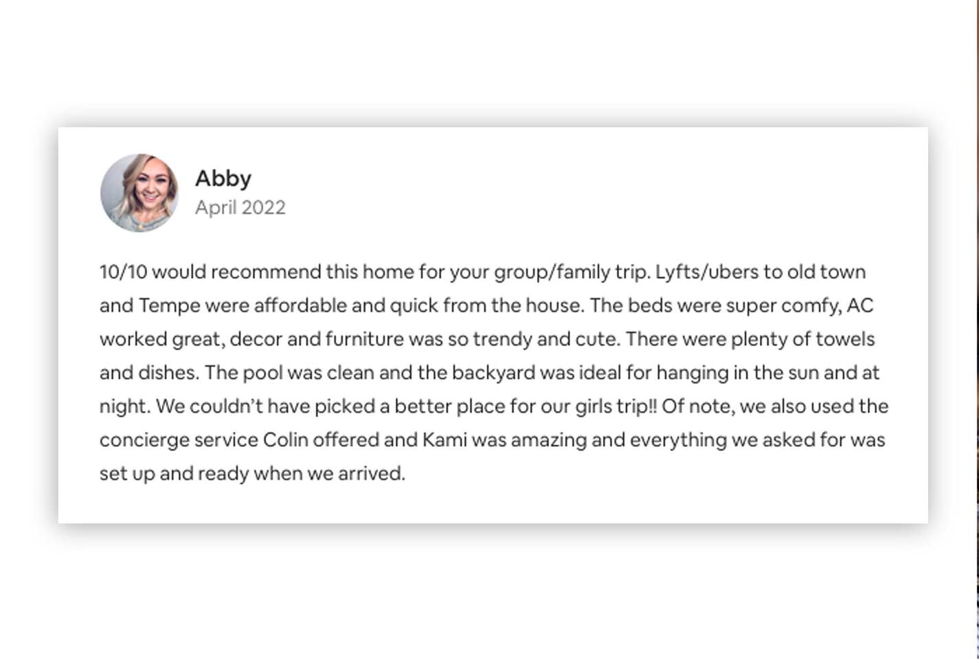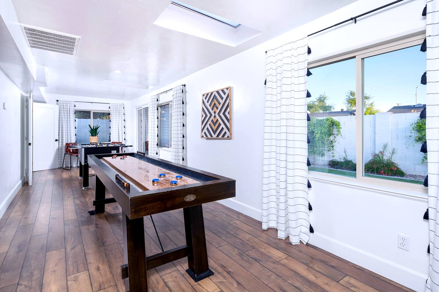 ☆☆ HIGHLIGHTS ☆☆ ✹ 5 spacious bedrooms; 1 king, 2 queens, 1 full, 2 twins ✹ 2 full bathrooms; essential toiletries provided ✹ Full kitchen w/ stainless steel appliances ✹ Complimentary coffee bar w/ Keurig machine ✹ Comfortable lounge w/ 65” smart TV ✹ Game room w/ pool table, foosball + shuffleboard ✹ Private backyard w/ heated pool, fire pit + yard games ✹ Central location w/ easy access to top attractions, best restaurants + vibrant nightlife ✹ Free parking ✹ High-speed WiFi + dedicated workspace ✹ Washer + dryer ✹ Central A/C + heating Eager to Read More? Here Are A Few Kind Words From Our Previous Guests: “Great place in a great location. Close to restaurants, fun hiking, the zoo, and the botanical gardens. The pool is private, clean, and the perfect temperature. Highly recommend staying here! Colin and his crew were top notch!” - Elizabeth “We had a great time staying at Colin’s place! It had everything we needed to enjoy our time in between activities. The pool and outdoor amenities were a favorite, and the table games inside were a bonus! There was enough room for all 8 of us to hang out comfortably and eat at the table together. On top of that, Colin was an AMAZING host! We would definitely stay here again in the future!” - Mickenzie “We had an amazing stay at Colin’s. The house was super clean and organized! The backyard and pool were a plus. Definitely recommend staying here.” - Karen ★★ BEDROOMS ★★ With five spacious bedrooms and seven beds, this home is the perfect place to accommodate up to 10 guests comfortably. Each inviting bedroom is beautifully decorated and stocked with amenities, including plush mattress toppers, comfy bedding, and room-darkening curtains. ✹Primary Suite: King-sized bed, ensuite bathroom, smart TV, work desk, carpet ✹Bedroom 2: Queen-sized bed, carpet ✹Bedroom 3: Queen-sized bed, carpet ✹Bedroom 4: Full-sized bed, hardwood floors ✹Bedroom 5: 2 twin beds, hardwood floors ★★ BATHROOMS ★★ Two charming full bathrooms provide a clean and stylish environment for all your personal needs. There is one ensuite bathroom attached to the primary suite and one hallway bathroom that caters to the other bedrooms. ✹Bathroom 1: Ensuite to the primary bedroom with a walk-in shower ✹Bathroom 2: Hallway bathroom with a shower/tub combo ✔ Essential toiletries provided (including shampoo, conditioner and body wash) ✔ Hair dryer ✔ Fresh towels ✔ Laundry room ★★ KITCHEN & DINING ★★ The full kitchen is equipped with everything you need to feel at home, including full-size modern appliances, plenty of counter space, and plenty of cookware and dinnerware. Large windows let in plenty of natural light and gorgeous wood beams create farmhouse vibes. ✔ Fully stocked kitchen w/ stainless steel appliances ✔ Complimentary coffee bar w/ Keurig coffee maker + drip coffee maker ✔ Basic cookware + dinnerware ✔ Oversized dining table w/ seating for 8 + kitchen island w/ seating for 4 ✔ High chair for kids ★★ LIVING ROOM + GAME ROOM ★★ After a long day in the Arizona sun, retreat to the comfortable lounge and stream all your favorite shows and movies on the flat-screen smart TV. If you’re craving a little more action, you can challenge your group to a pool tournament, a shuffleboard showdown, or a friendly foosball match - all located just off the living room. ✔ Comfortable lounge w/ 65” flat-screen smart TV ✔ Wood-burning fireplace ✔ Game room w/ pool table, shuffleboard, and foosball ★★ OUTDOOR SPACE ★★ Step into the private backyard and make lasting memories while enjoying the resort-like amenities. Take a dip in the sparkling pool (no fees for heating), relax on a sun lounger, or gather around the firepit once the sun goes down. There is plenty of outdoor seating, a corn hole game, a BBQ, and a fun cactus mural that provides the perfect backdrop for taking holiday photos. ✔ Private backyard; fully fenced for privacy ✔ Heated pool (no fees) ✔ Propane fire pit w/ comfy lounge space + string lights ✔ Corn hole ✔ BBQ ★★ ACTIVITIES/ATTRACTIONS ★★ One of the best parts about this pristine property is its location in central Scottsdale. You’ll be just minutes from all of Scottsdale’s best restaurants, top attractions, and vibrant nightlife. Here are some of the best options near you: ✔ Butterfly Wonderland: Immerse your family in the enchanting world of butterflies at Butterfly Wonderland, the largest indoor butterfly conservatory in the U.S., offering a magical and educational experience for all ages. ✔ Camelback Mountain - Cholla Trailhead: Embark on a family hiking adventure at Camelback Mountain's Cholla Trailhead, offering moderate trails and stunning panoramic views of the valley, creating a memorable outdoor experience. ✔ Old Town Scottsdale: Experience the charm of Old Town Scottsdale, where you can explore boutique shops, and art galleries, and enjoy family-friendly dining options in a vibrant and historic setting. ✔ Scottsdale's McCormick-Stillman Railroad Park: Create lasting family memories at McCormick-Stillman Railroad Park, where you can ride the carousel, explore the railroad exhibits, and enjoy a relaxing picnic in a charming park setting. ✔ Scottsdale Stadium: Catch a baseball game at Scottsdale Stadium, the spring training home of the San Francisco Giants, providing an exciting sports experience for families who love America's pastime. All these activities and more are within your reach when you book with us! ★☆ Book Today & Let Us Take Care Of You In Scottsdale! ☆★